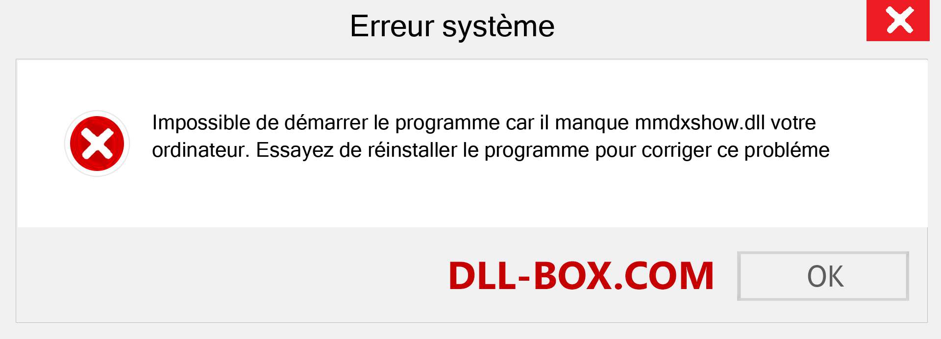 1. Le programme ne peut pas démarrer car mmdxshow.dll est absent de votre ordinateur. Essayez de réinstaller le programme pour résoudre ce problème.